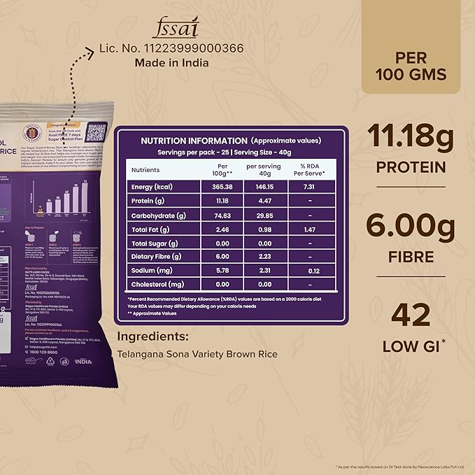 Low GI brown rice designed for sugar control. High in fiber, gluten-free, and 100% organic. Supports healthy blood sugar, weight management, and balanced diets.