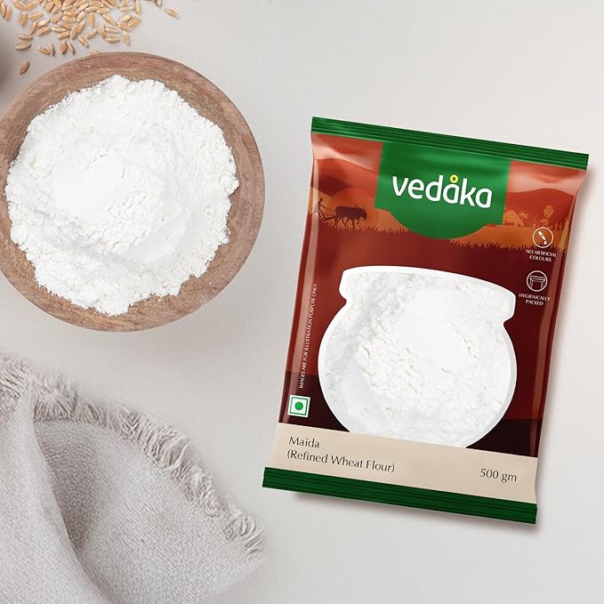 Vedaka Refined Wheat Flour (Maida) is finely milled, smooth-textured, and ideal for baking, pastries, breads, and traditional Indian recipes.