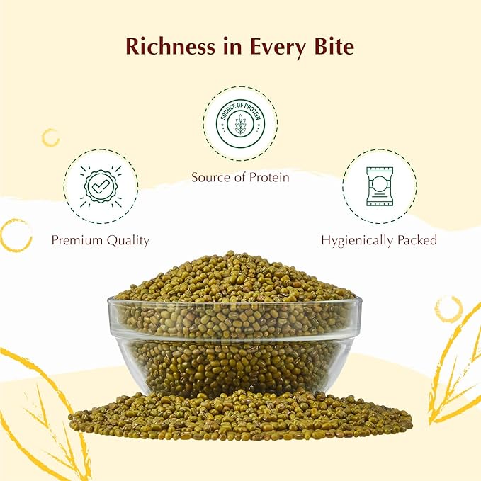 Packed with plant-based protein, essential vitamins, minerals, and dietary fiber, Green Moong Dal supports muscle health, digestion, and overall wellness. It is naturally cholesterol-free, making it an excellent choice for healthy, balanced diets.